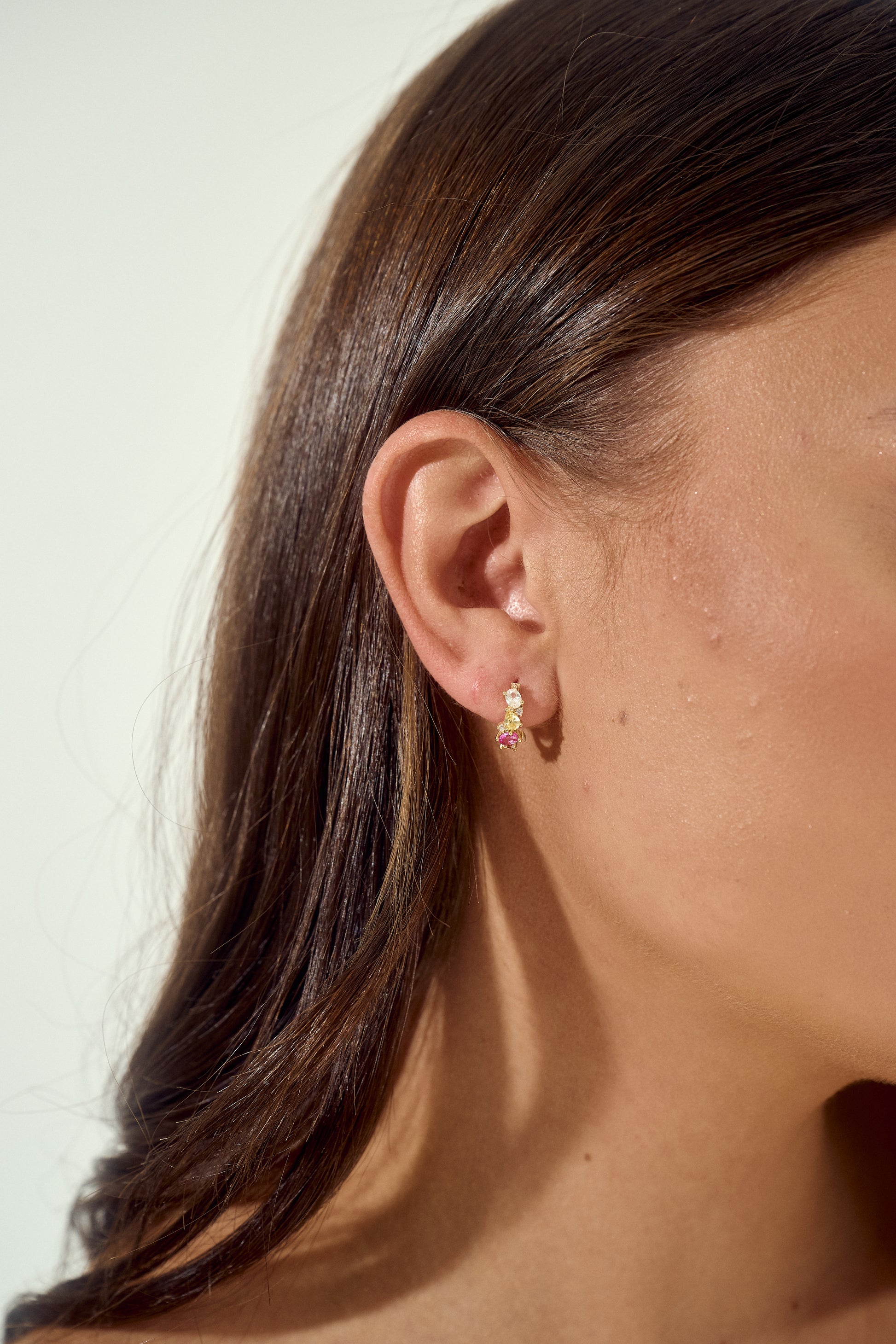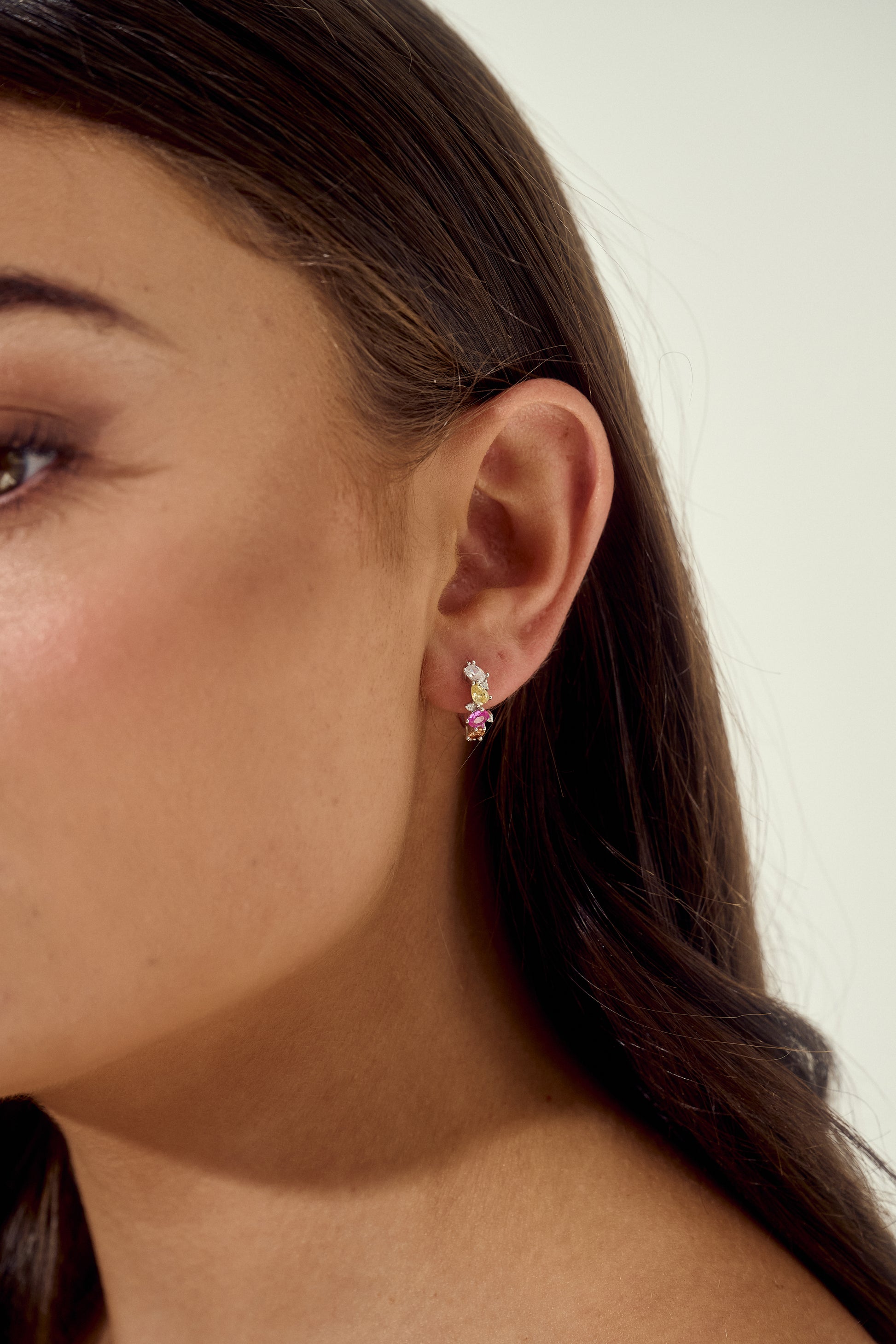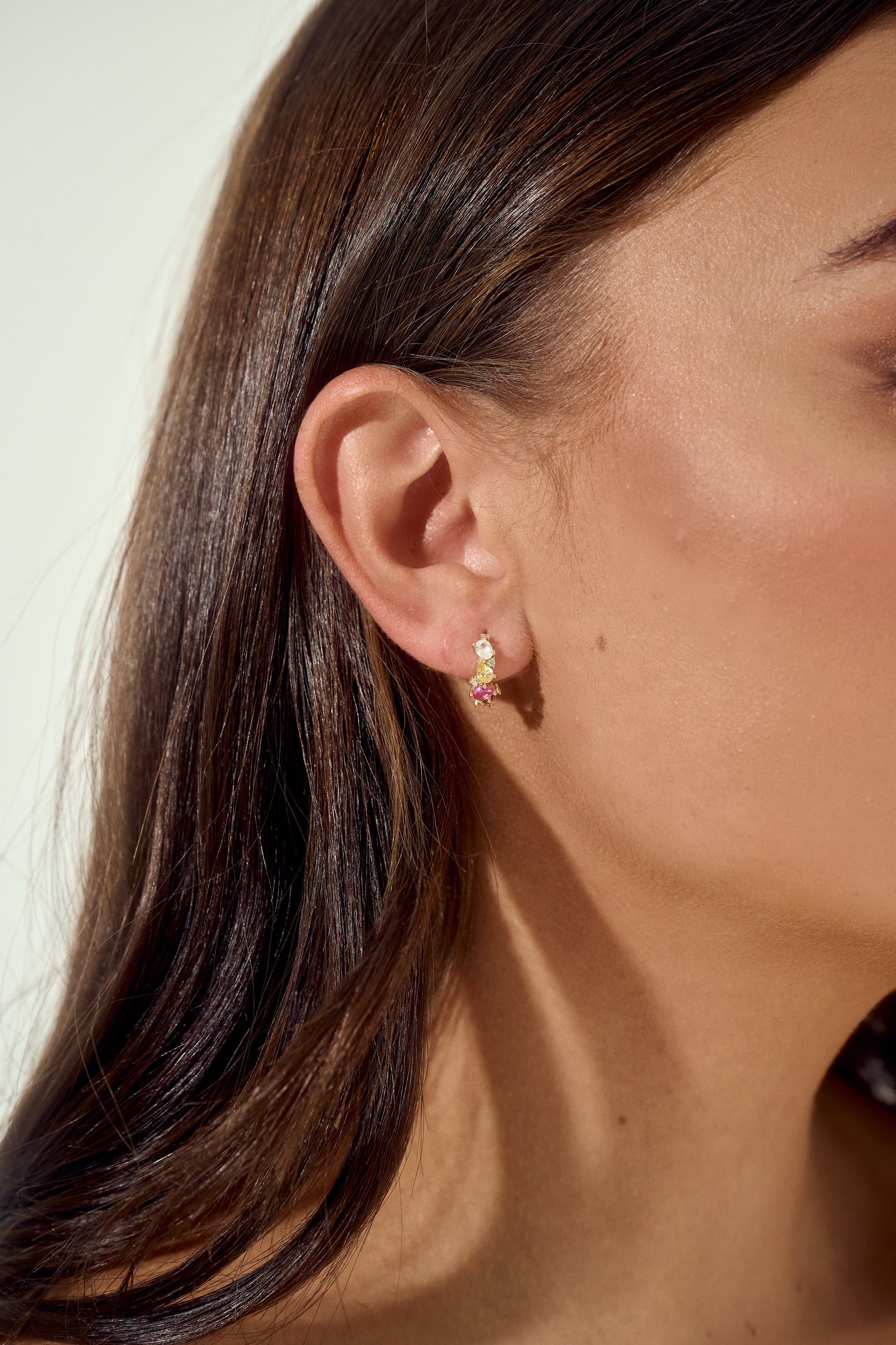 Introducing our stunning multi-colour stone huggie earrings! These delightful accessories feature an array of uniquely shaped cut stones, each radiating its own vibrant hue. Available in both luxurious gold and sleek silver, they effortlessly elevate any outfit. Perfect for adding a pop of colour to your look, these earrings are designed for comfort and style. Embrace your individuality and shine bright with these charming huggies!
