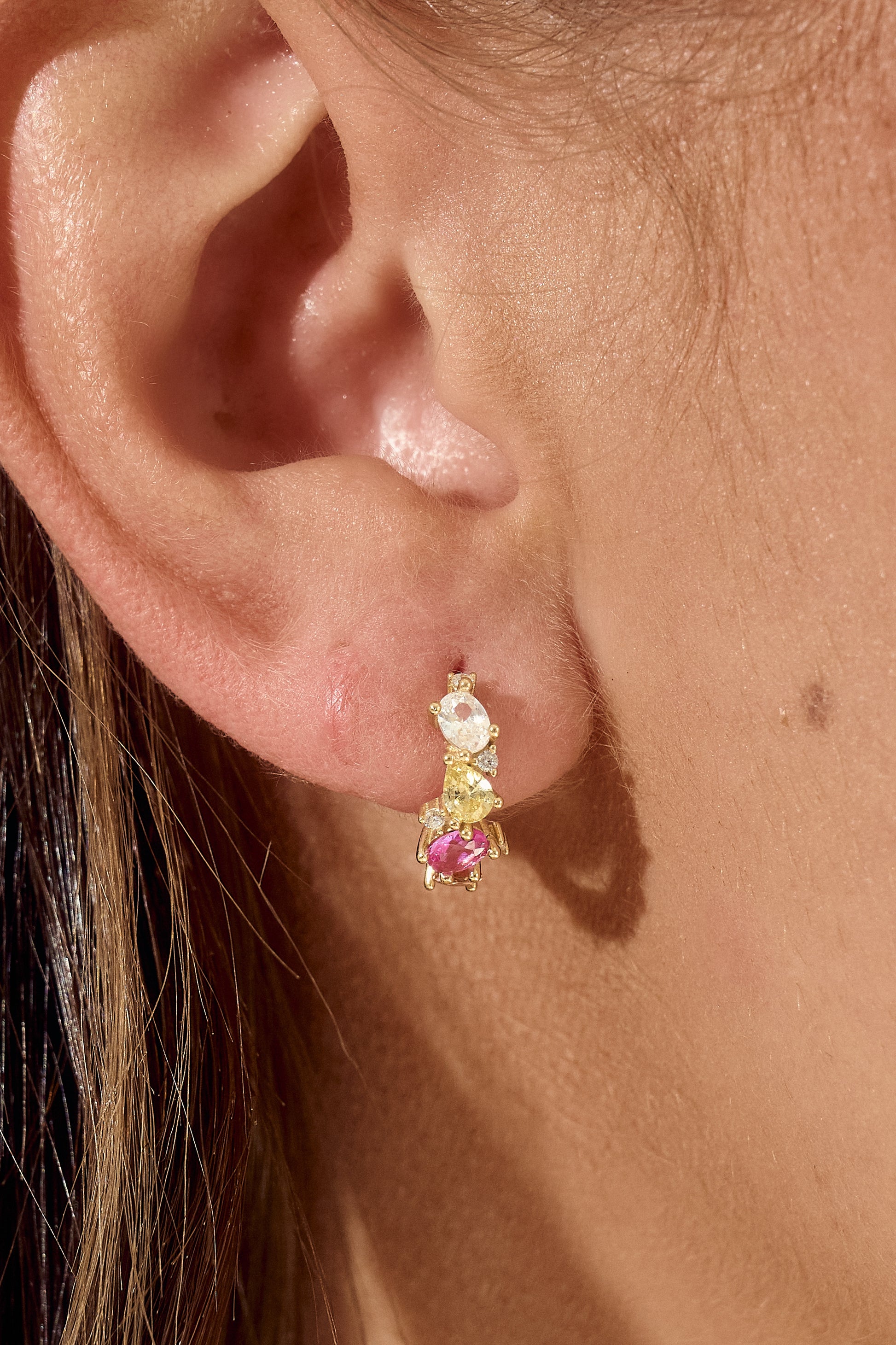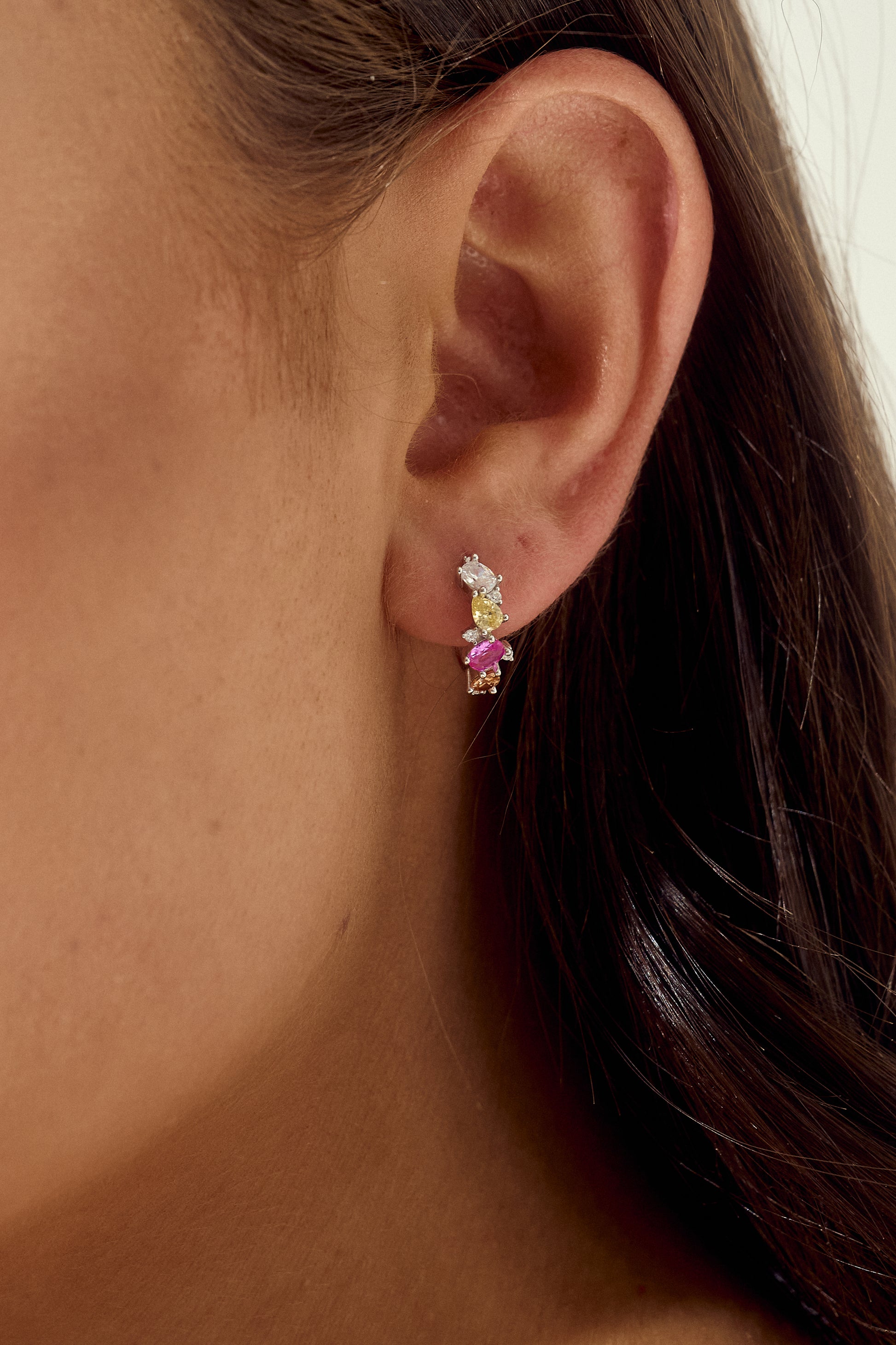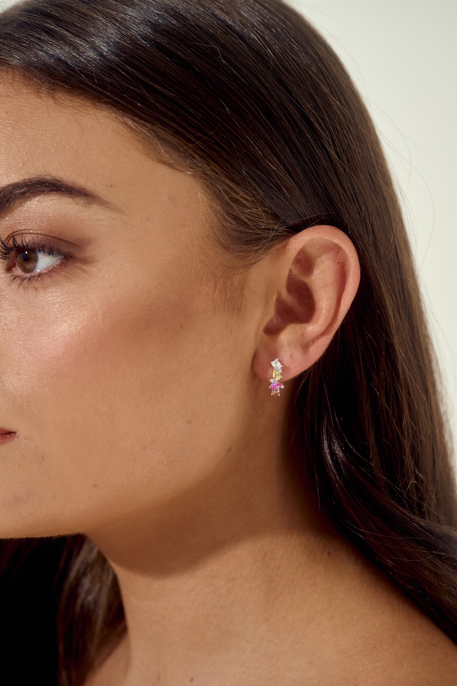 Introducing our stunning multi-colour stone huggie earrings! These delightful accessories feature an array of uniquely shaped cut stones, each radiating its own vibrant hue. Available in both luxurious gold and sleek silver, they effortlessly elevate any outfit. Perfect for adding a pop of colour to your look, these earrings are designed for comfort and style. Embrace your individuality and shine bright with these charming huggies!