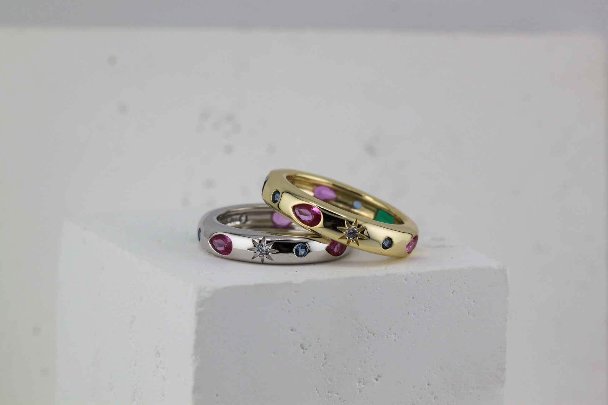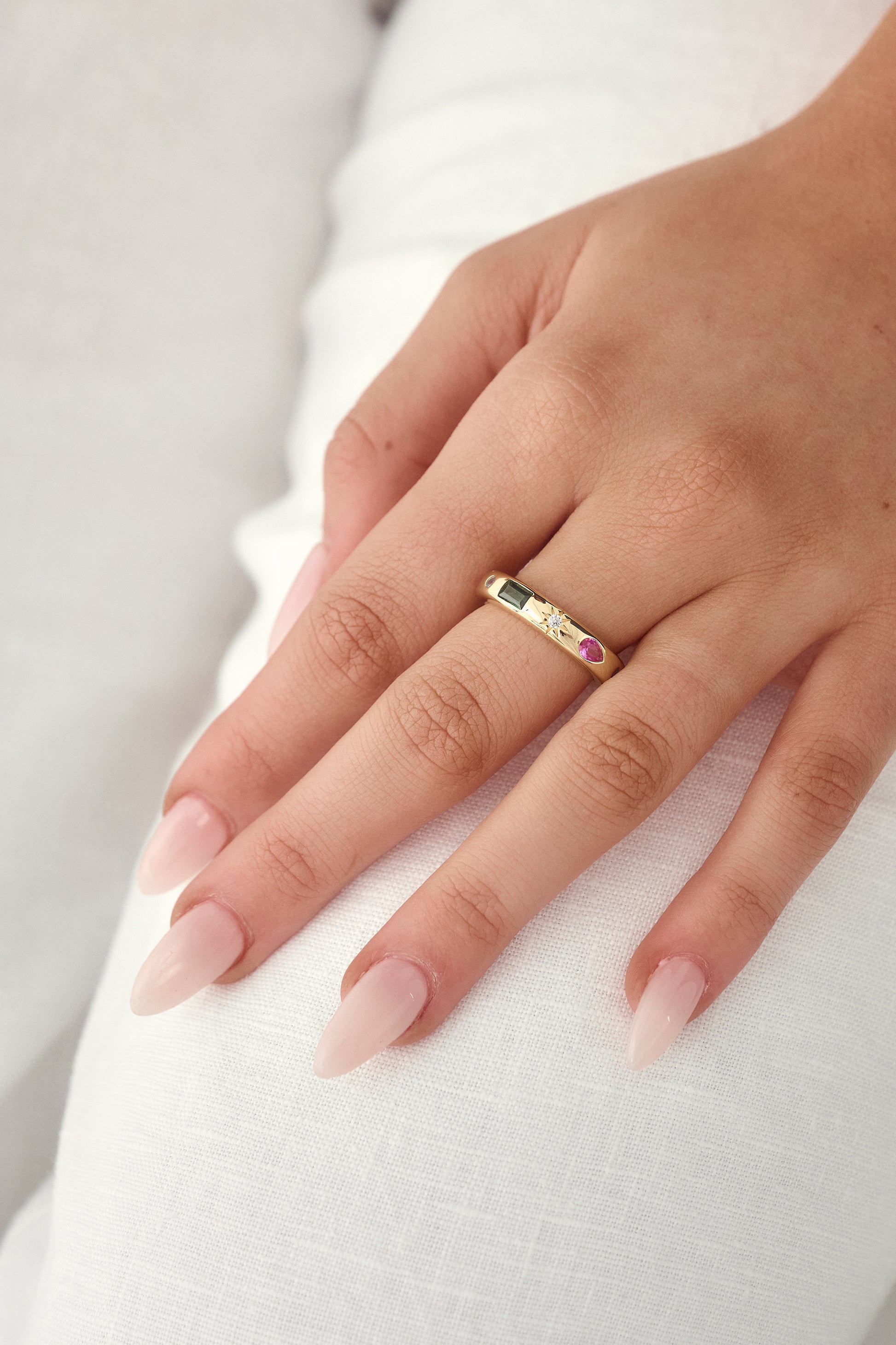 Multi colour stone ring with 1 micron gold plating for increased longevity.