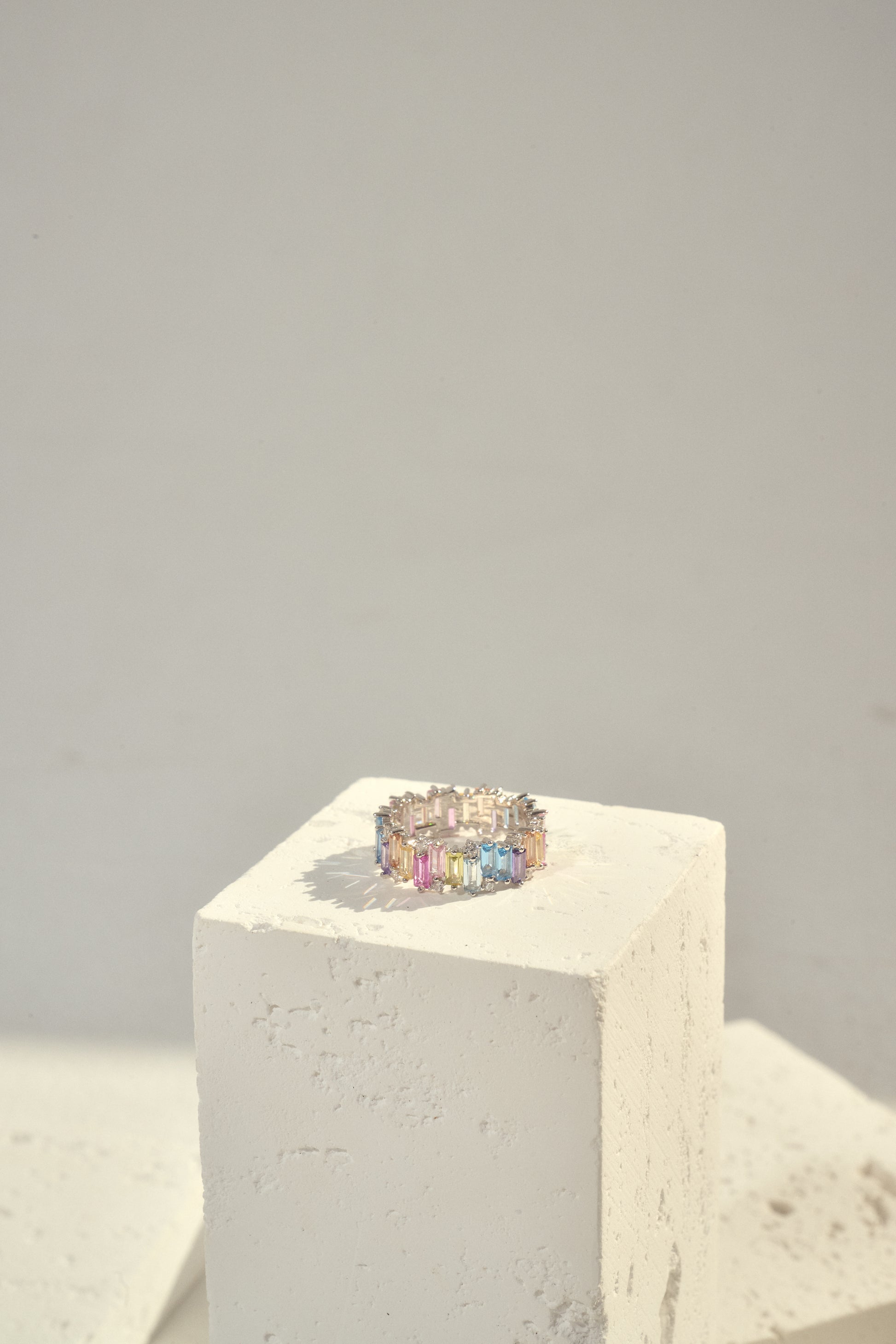Multi coloured cubic zirconia eternity band. Stones cover entire ring.